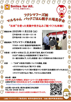 福島県伊達郡桑折町にあるフクシマフーズ株式会社にて、11月22日(土)に、小学生とその保護者を対象とした「マルちゃん パックごはん親子工場見学会」を開催いたします。