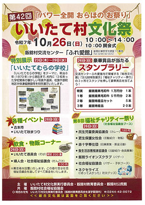 飯舘村では、「パワー全開 おらほの お祭り」第42回いいたて村文化祭を開催いたします。特別展示は「いいたてむらの学校」をテーマに、学校関係の懐かしい写真や道具、校旗や原町地区中体連優勝旗等を展示します。また、福祉チャリティー祭りや飯舘村商工会主催のいいたて秋まつりも同時開催。ステージイベントや出店もありますので、飯舘村交流センター「ふれ愛館」にぜひお越しください。