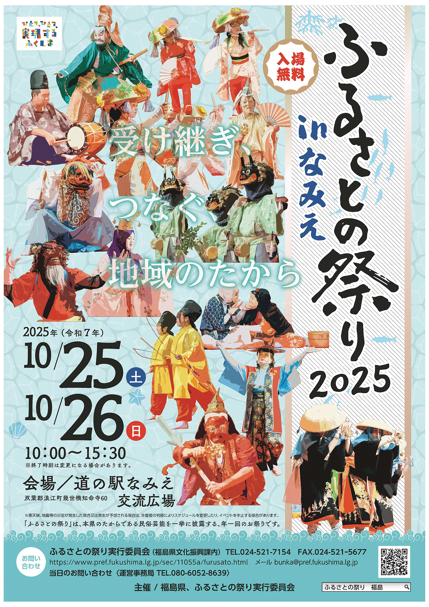 「ふるさとの祭り」は、地域の宝である民俗芸能の継承や人々の絆の再生を図るため、2013年より県内各地で開催しており、今年は「道の駅なみえ」が会場となります。県内各地で受け継がれ守られている様々な神楽、踊り、舞などが一挙に披露される、年1回の貴重な機会となっておりますので、是非会場にお越しいただきお楽しみください。