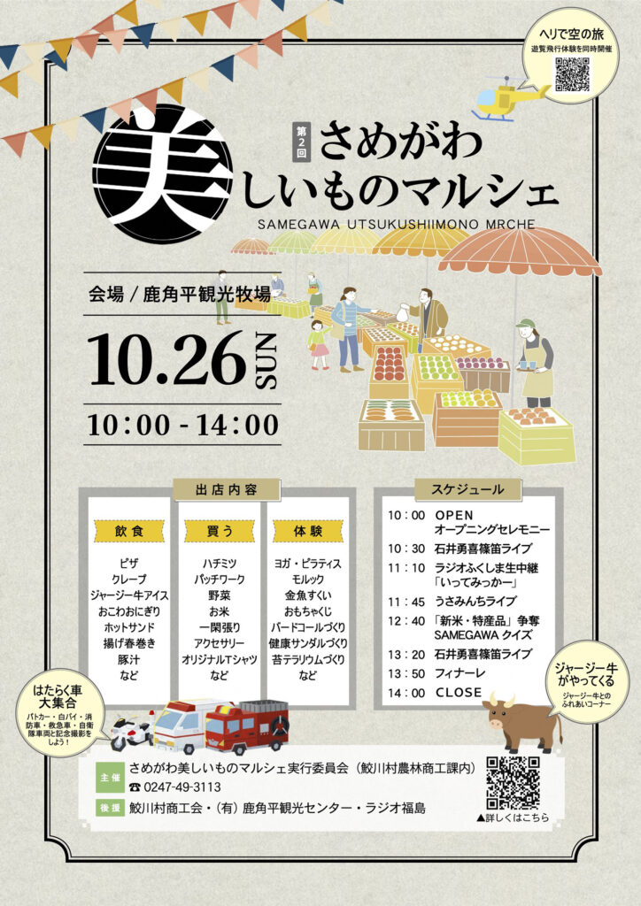 村は、「来て!見て!知って!村の魅力発信事業」として、10月26日(日)に鹿角平観光牧場で【第2回さめがわ美しいものマルシェ】を開催します。