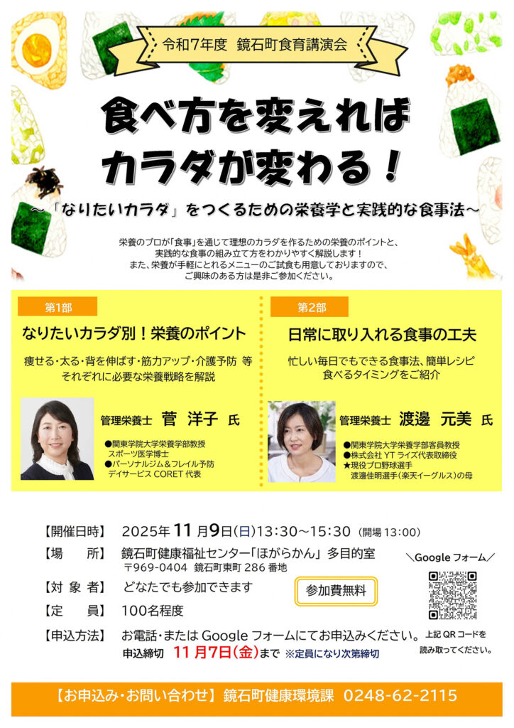 【ミッション告知】令和7年度鏡石町食育講演会「食べ方を変えればカラダが変わる!」に参加しよう!