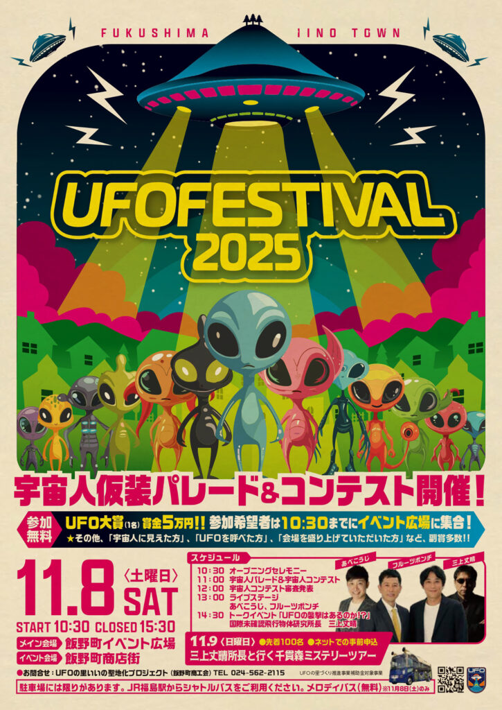 福島市飯野町で、今年で4回目となる「UFOフェスティバル2025」が開催されます。宇宙人パレード&コンテストを見ながら、簡単な健康チェックをしてみませんか? 今年は骨の健康度の測定ができます。骨の健康度を測り、家庭でできる骨粗しょう症予防に取り組んでみませんか? 健康づくりブースでお待ちしております。