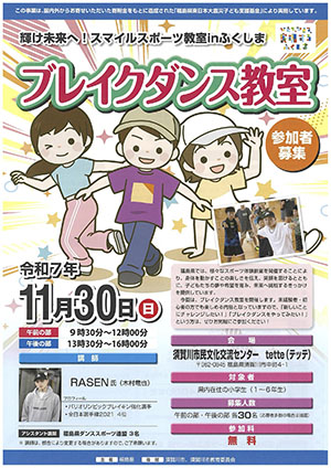 福島県スポーツ課では、ブレイクダンス教室を開催します。未経験者や初心者の小学生を対象とした教室で誰もが楽しめる内容となっていますので「新しいことにチャレンジしたい!」「ブレイクダンスをやってみたい!」という方はぜひお気軽にご参加ください。
