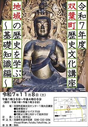 これまで町教育委員会では、歴史や文化に関する講座を開催してまいりました。今回は双葉町出身の研究者2名を招き、双葉町を知るための歴史や文化について講演をしていただきます。