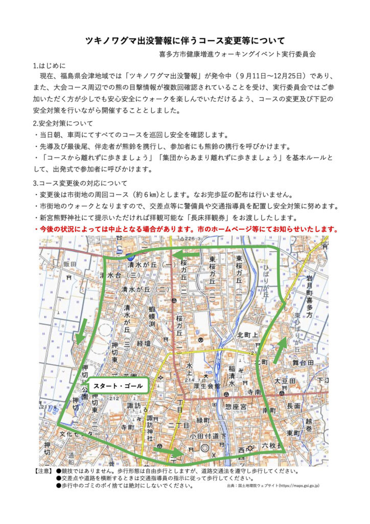 11月15日(土)に開催される「秋の喜多方・長床ウォーク2025」がツキノワグマ出没警報に伴い、コースの変更および安全対策を行いながら開催することとしました。