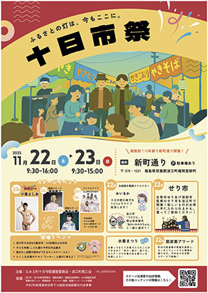 150年以上の歴史のある、浪江町最大級のお祭りである「なみえ町十日市祭」は、本年15年ぶりに新町通りへと会場を移して開催されます。本来の十日市の目的であった、お買い物を楽しむ市として、11日にはイベントの目玉となるセリ市を開催。100店舗以上の露店等が軒を並べ、ステージでは歌謡ステージやお笑いライブ、ふくしま応援ポケモンの「ラッキー」も遊びに来ます。おじいちゃんからお子様まで家族そろって楽しめる企画が盛りだくさんの「なみえ十日市祭」に、家族みんなで遊びに来てください。