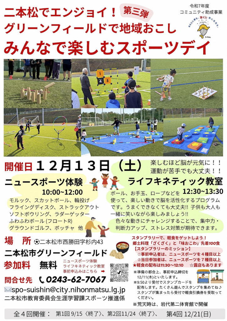 12月13日(土)に開催される「二本松でエンジョイ! グリーンフィールドで地域おこし」~みんなで楽しむスポーツデイ~ 第三弾 に参加し、200ポイントをゲットしよう!