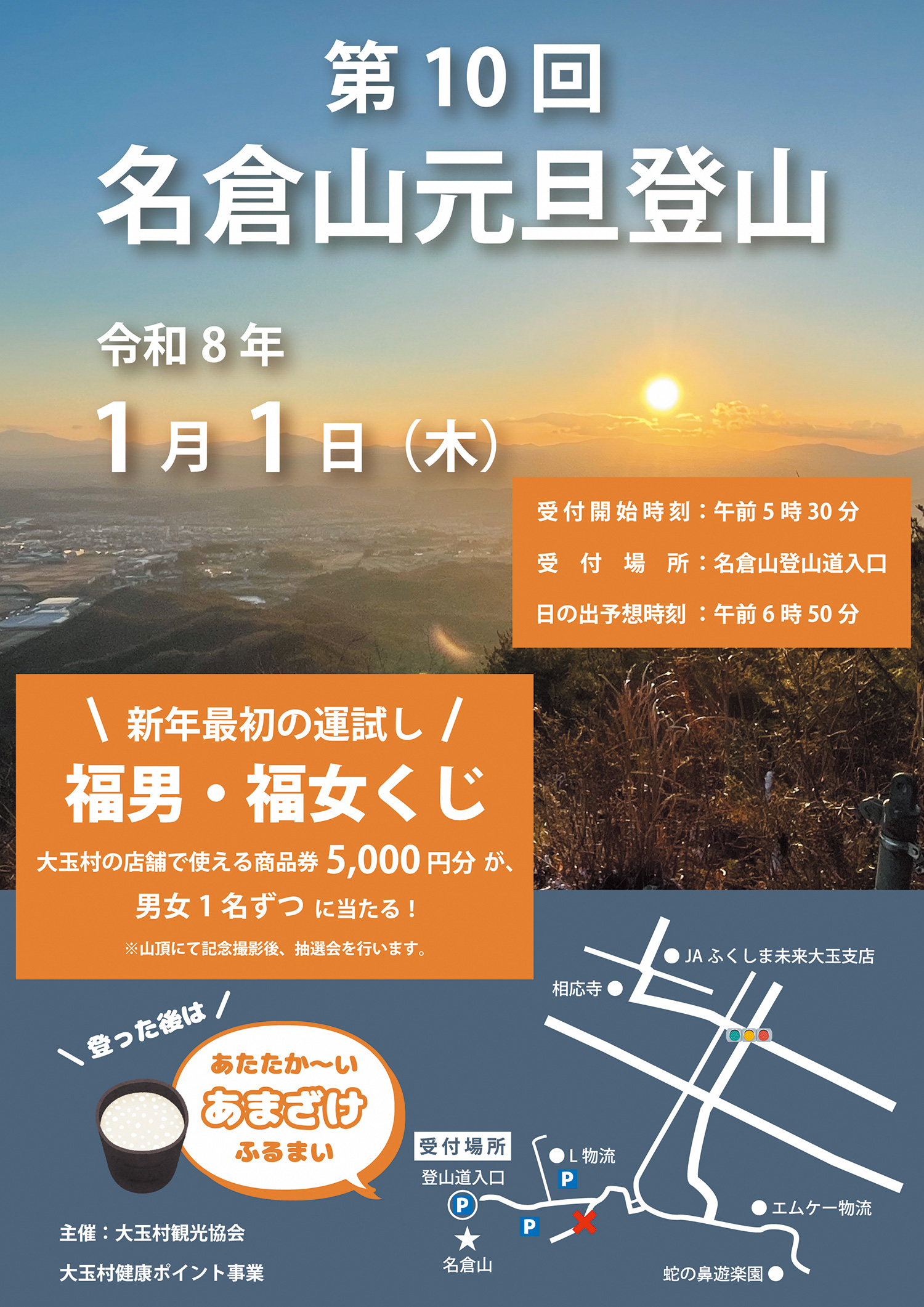 また、参加は無料となっており、温かい甘酒もご用意しておりますので、この機会にぜひ名倉山へお越しください。