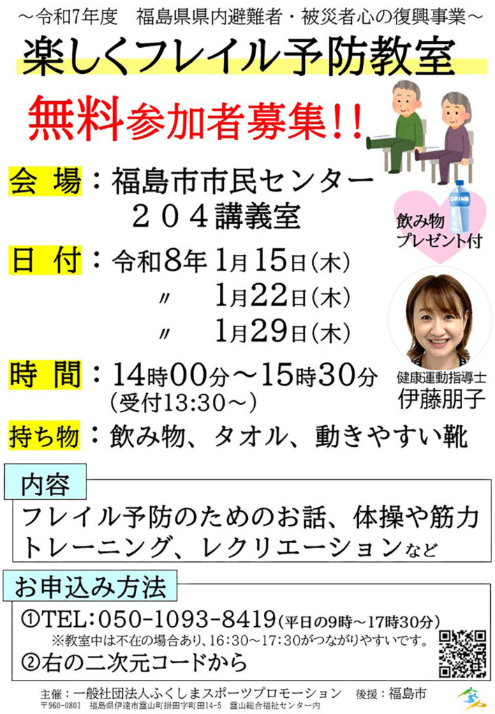 2026年1月に開催される「福島県民アクティブライフ促進事業 楽しくフレイル予防教室(福島市)」に参加し、200ポイントをゲットしよう!(週1回まで)