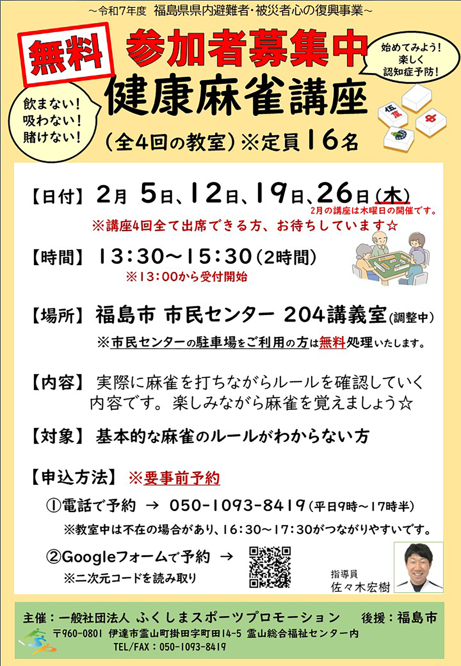 【ミッション告知】「福島県民アクティブライフ促進事業 健康麻雀教室【2月全4回】」に参加しよう!