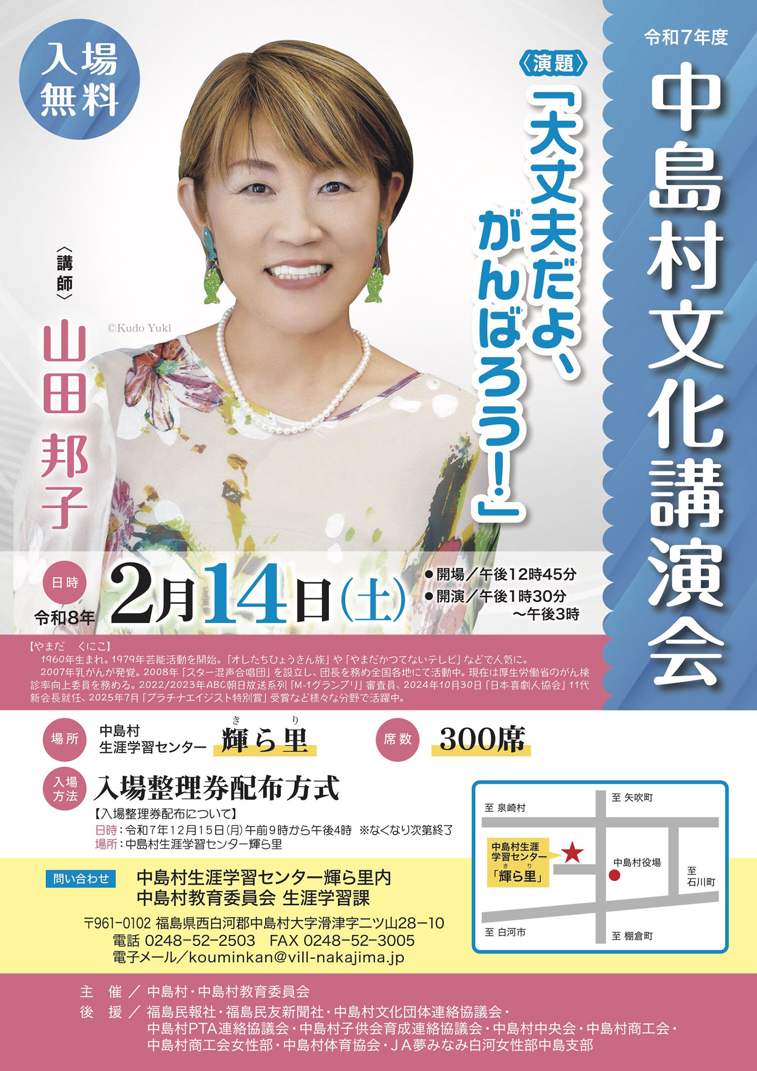令和7年度中島村文化講演会をテレビやメディアでおなじみの「山田邦子」氏をお呼びし、実施いたします。聴講を希望する方は、入場整理券をご準備ください。入場整理券はなくなり次第終了となります。あらかじめご承知おきください。