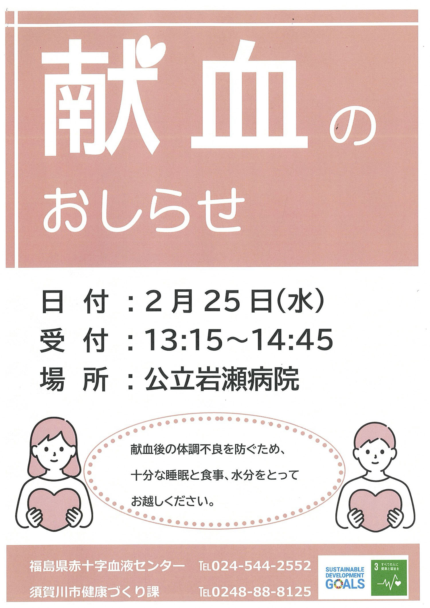 2月25日(水)に開催される「献血バスがやってくる! in 公立岩瀬病院」に参加し、200ポイントをゲットしよう!