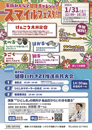 本市の健康増進計画である「健康いわき21」の推進及び普及・啓発に努め、市民が心身ともに健康で、いきがいを持って生活ができる社会の実現に寄与することを目的に、関係機関・団体などの協力と参加のもと、「第24回健康いわき21推進市民大会」を開催します。