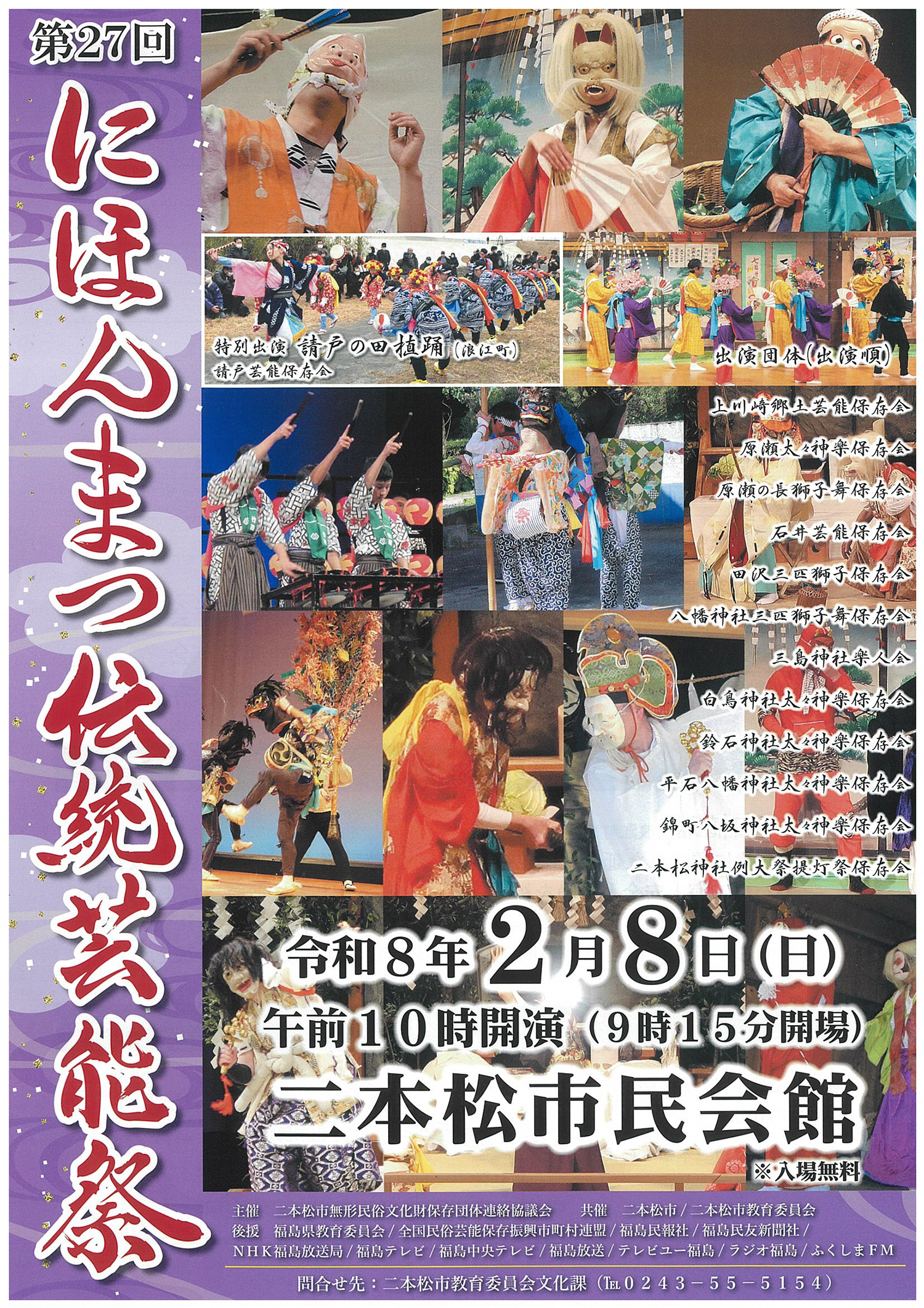 神楽や獅子舞、祭り囃子など、長い伝統に培われ、今日まで伝えられてきた二本松の民俗芸能に親しんでいただく催しです。今回は浪江町から「請戸の田植踊」が特別出演いたします。皆様お誘いあわせの上、どうぞご観覧ください。