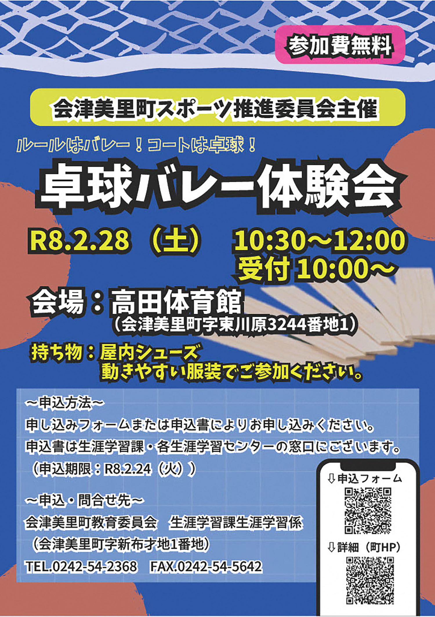 2月28日(土)に開催される「会津美里町卓球バレー体験会」に参加し、200ポイントをゲットしよう!