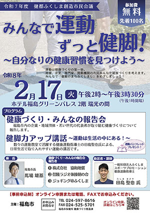 運動に取り組む福島市内の企業・地域団体・若い世代の代表者からの報告のほか、健康運動指導士田島聖也氏による健脚力アップ講話、「健脚チェック・けんトレ」体験コーナーなどもあります。